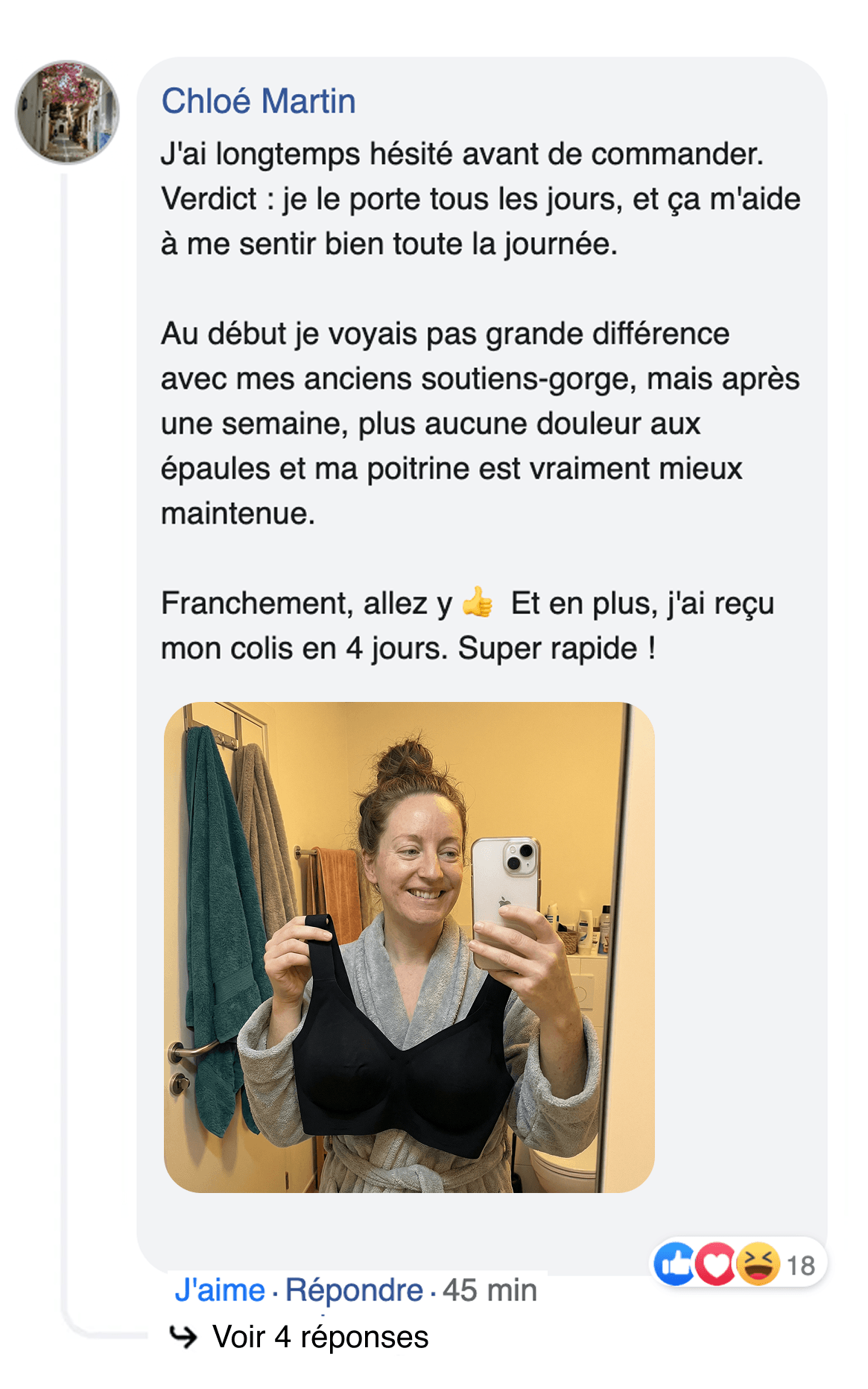 Une amie médecin m'avait conseillé ce type de brassière pour éliminer le mal de dos à cause de ma poitrine. Je les teste depuis deux semaines et c'est vrai qu'il est super agréable à porter et je n'ai plus aucune douleur. Je l'utilise aussi quand je fais du sport et il maintient vraiment bien les seins contrairement à un soutien gorge classique. On sent qu'il est vraiment fait pour être confortable au maximum. Je ne le quitte plus.